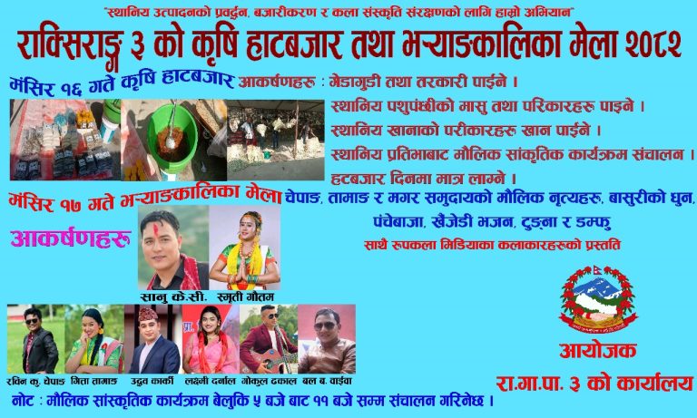 राक्सिराङ्ग पलाँसेमा मंसिर कृषि हाटबजार र भर्याङ्गकालिका मेलाको तिव्र तयारी २०८२ मंसिर १४, आईतवार १७:०९