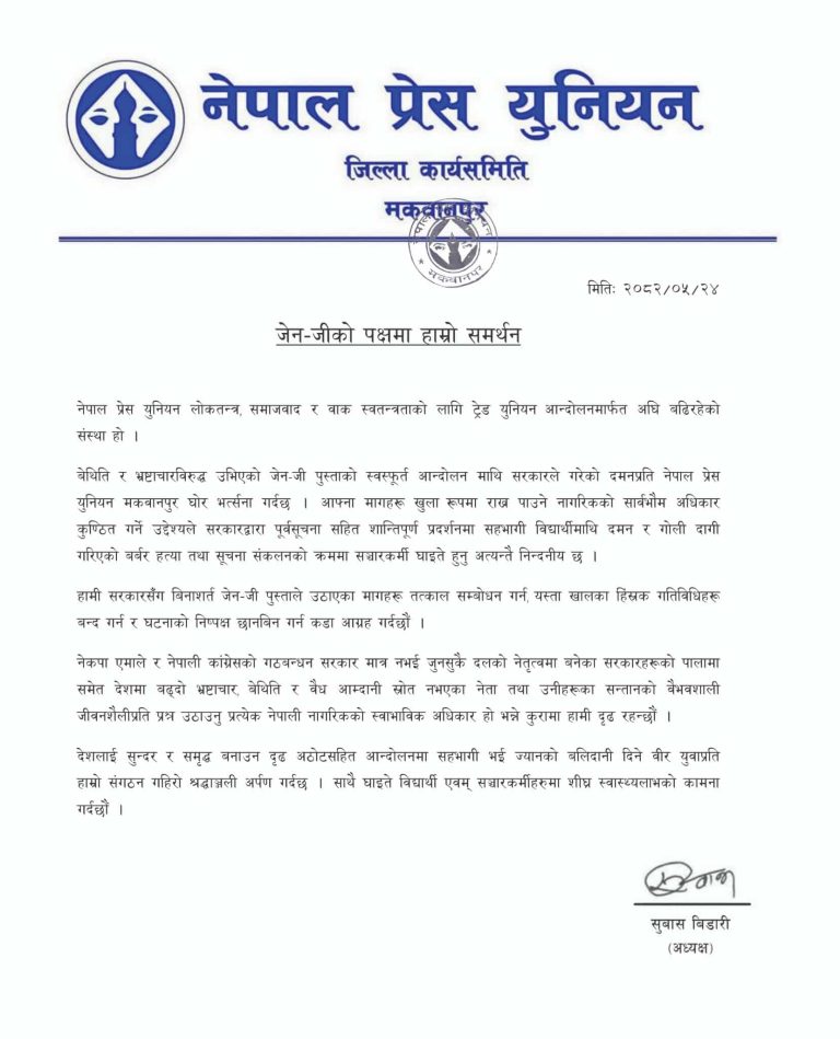 जेन-जी आन्दोलनमाथि भएको दमनप्रति प्रेस युनियन मकवानपुरको घोर आपत्ति