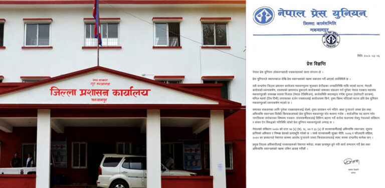 जिल्ला प्रशासनभित्र पत्रकारहरुलाई रिपोर्टिङमा रोक 'प्रेस स्वतन्त्राको पक्षमा उभिन प्रजिअलाई प्रेस युनियन मकवानपुरको आग्रह' २०८२ असार ६, शुक्रबार १५:०७