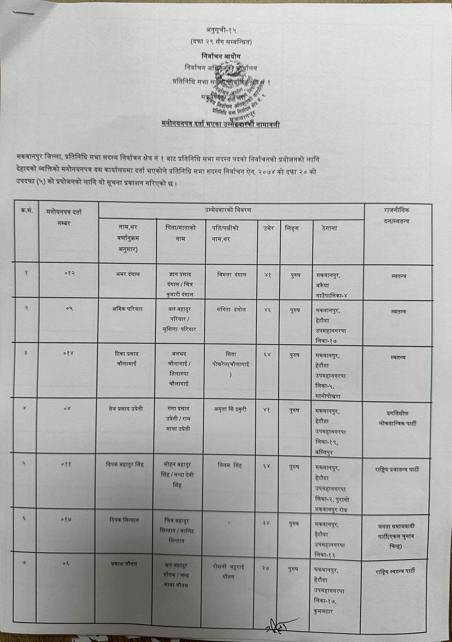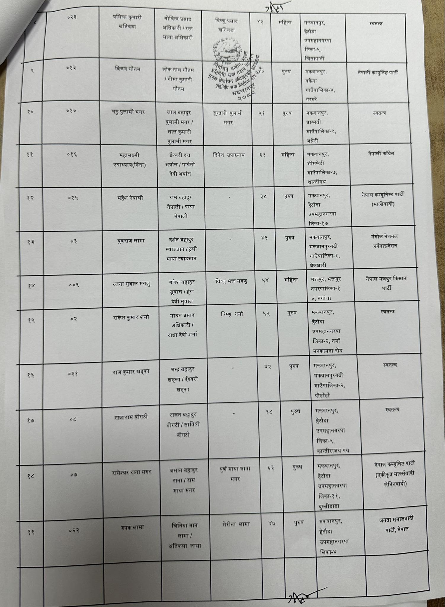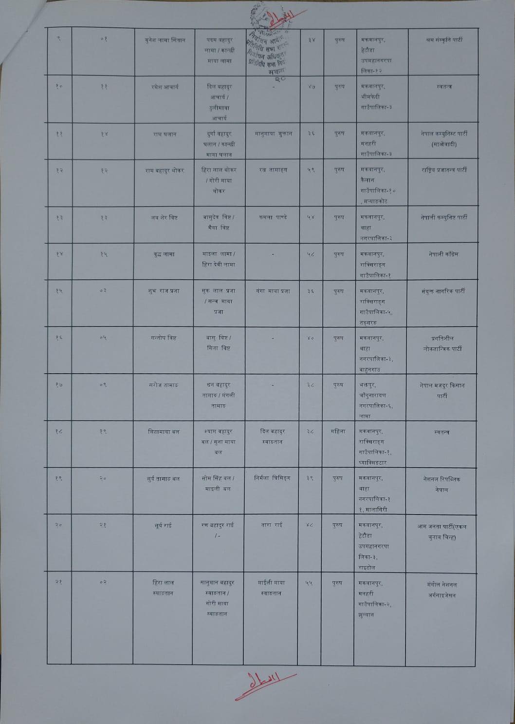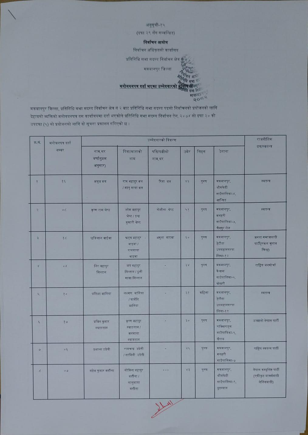 मकवानपुर । २१ फागुनमा हुने प्रतिनिधिसभा निर्वाचनका लागि मकवानपुर जिल्लाबाट ४४ जनाले उम्मेदवारी दर्ता गराएका छन्। निर्वाचन आयोगले तोकेको मनोनयन तालिकाअनुसार मंगलबार दलका तर्फबाट २९ जना र स्वतन्त्रतर्फ १५ जनाले उम्मेदवारी दर्ता गराएका मुख्य निर्वाचन अधिकृतको कार्यालयले जनाएको छ।