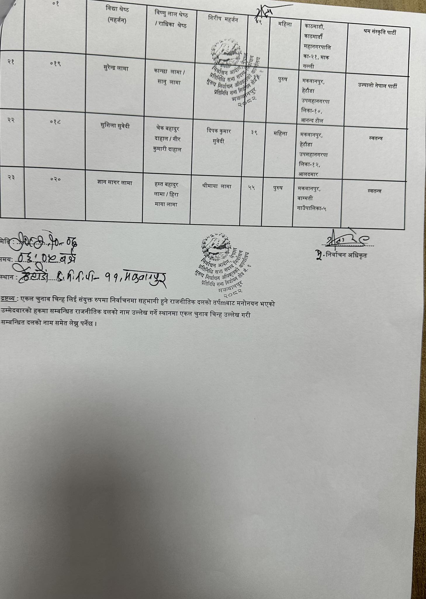 प्रगतिशील लोकतान्त्रिक पार्टीबाट क्षेत्र नम्बर १ मा तेज प्रसाद उप्रेती र क्षेत्र नम्बर २ मा सन्तोष विष्ट उम्मेदवार बनेका छन्। श्रम संस्कृति पार्टीबाट क्षेत्र नम्बर १ मा विद्या श्रेष्ठ र क्षेत्र नम्बर २ मा युनिश लामाले उम्मेदवारी दर्ता गराएका छन्।