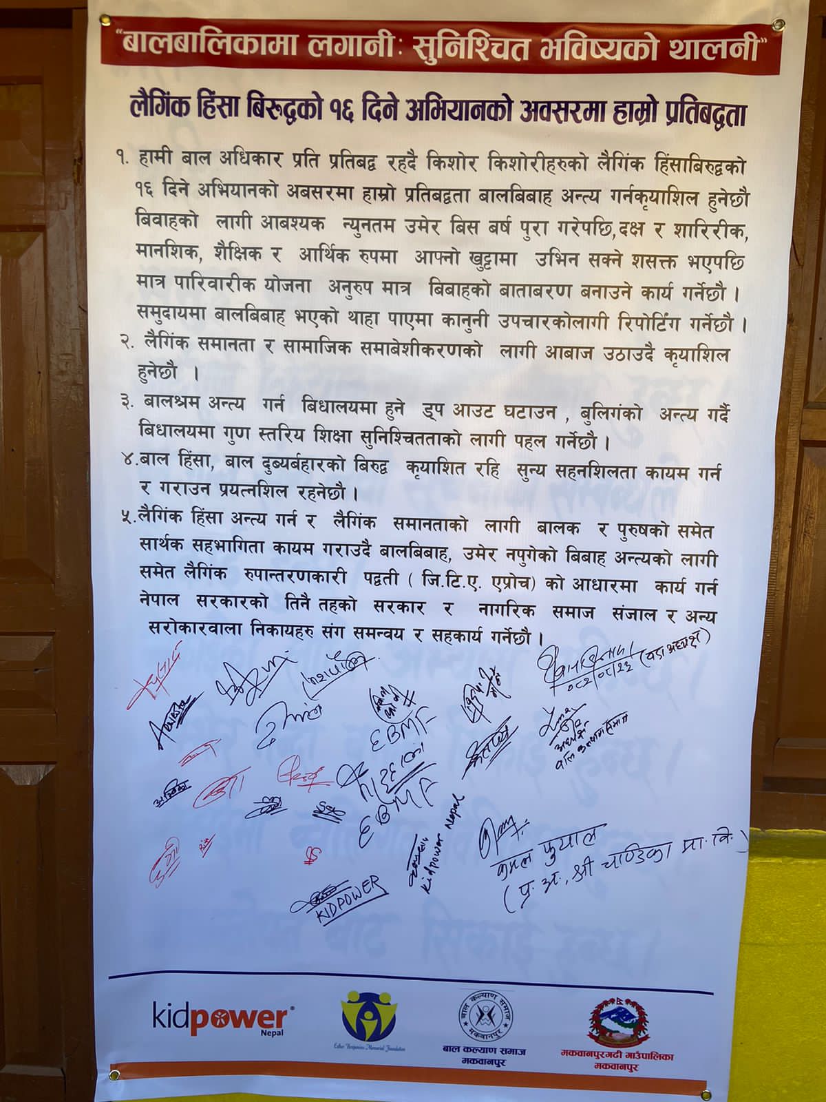 किडपावर, ईस्थर बेन्जामिन मेमोरियल फाउन्डेशन, बालकल्याण समाज मकवानपुर र मकवानपुरगढी गाउँपालिकाको संयुक्त आयोजनामा सम्पन्न कार्यक्रममा किडपावरकी अन्तर्राष्ट्रिय प्रशिक्षक सुष्मा पोखरेलले किशोरीलाई हिंसाबाट कसरी जोगिने, जोखिममा परे प्रतिकार गर्ने तरिका तथा भौतिक आत्मरक्षाका कौशलबारे प्रशिक्षण दिइन्।