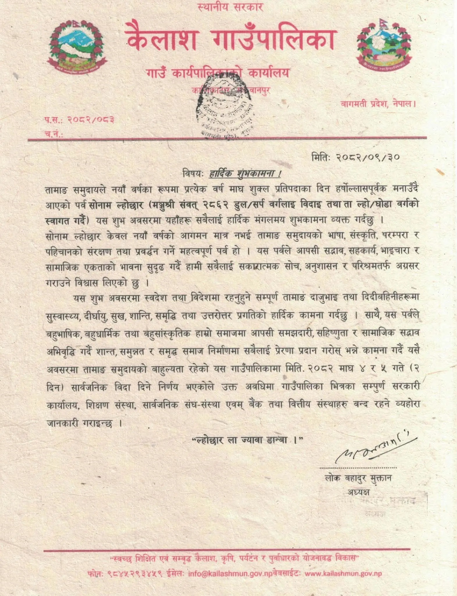 मकवानपुर । कैलाश गाउँपालिकाले तामाङ समुदायको नयाँ वर्ष सोनाम ल्होसारको अवसरमा शुभकामना व्यक्त गर्दै गाउँपालिकाभित्र दुई दिन सार्वजनिक बिदा दिने निर्णय गरेको छ ।
