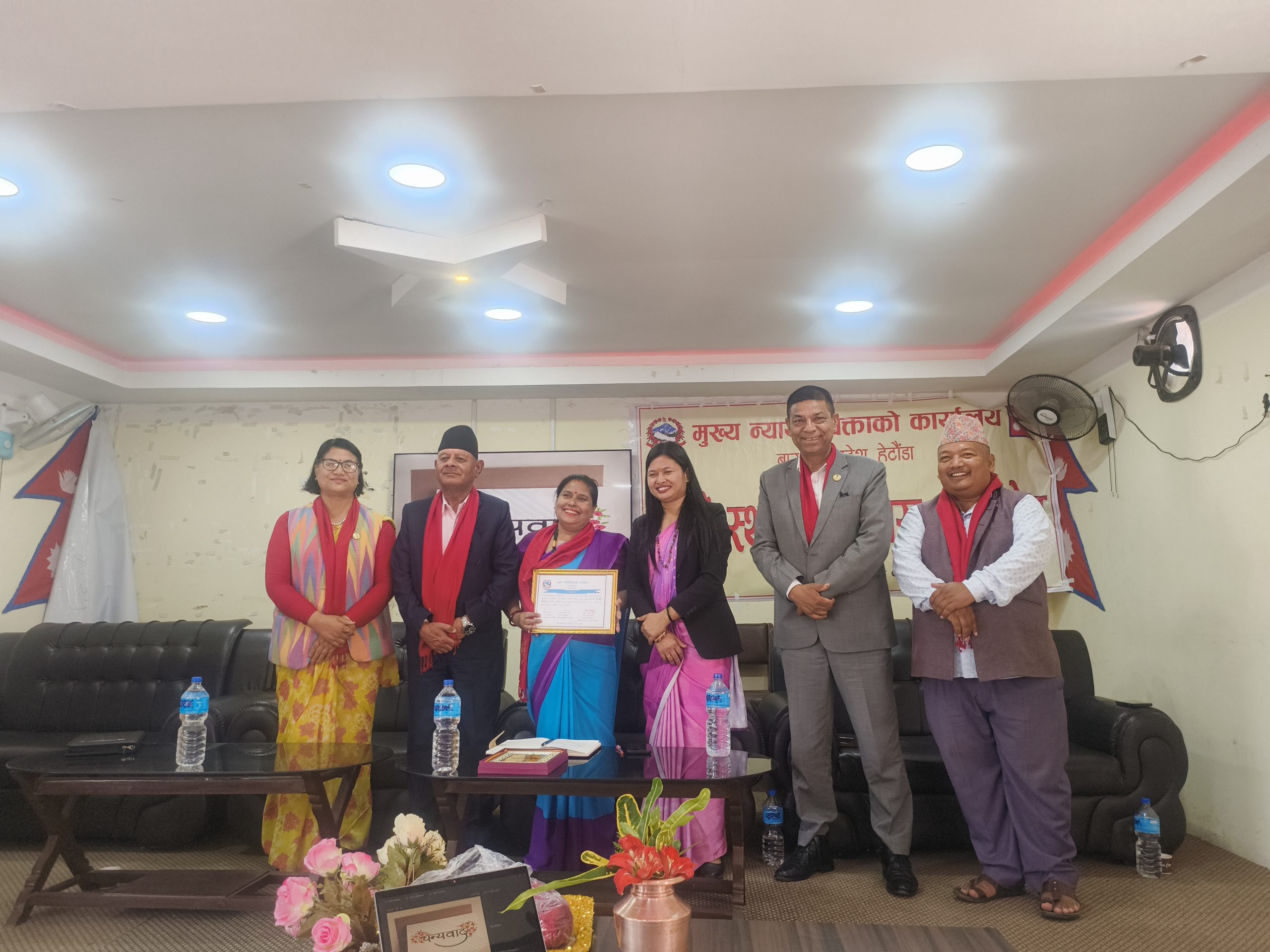 कार्यक्रमकै क्रममा हेटौंडास्थित मुख्य न्यायाधिवक्ताको कार्यालयकी कार्यालय सहयोगी चन्द्रावती अधिकारीलाई नगदसहित प्रमाणपत्र प्रदान गरी सम्मान गरिएको थियो।
