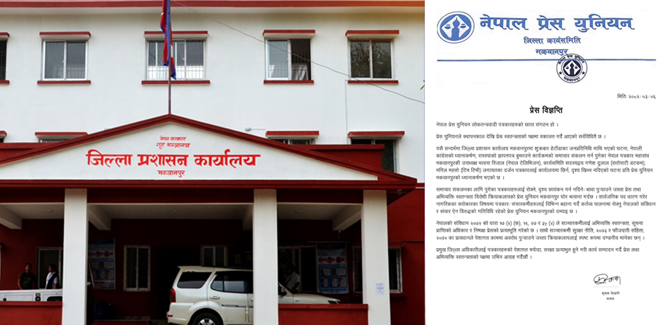 शुक्रबार जिल्ला प्रशासन कार्यालय मकवानपुरका समाचार संकलन गर्न रोकेको विषयमा युनियन मकवानपुरले विज्ञप्ती जारी गर्दै उक्त घटनाको घोर भत्सना गरेको छ ।